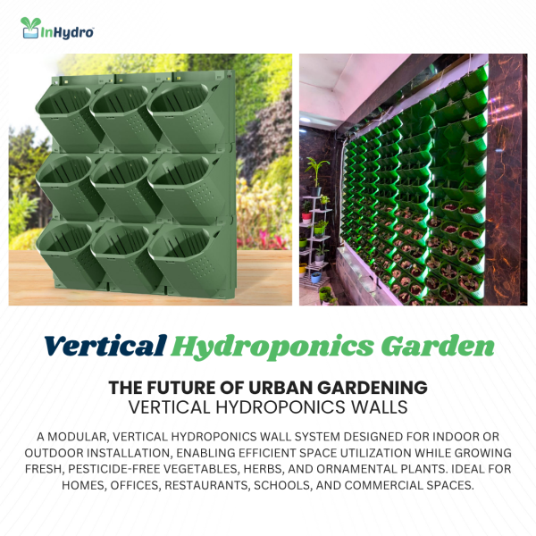 The INHYDRO Vertical Hydroponics Wall Garden is a modern, space-saving solution designed to turn any wall—indoors or outdoors—into a beautiful and productive living garden. Built with durable UV-stabilized panels and an integrated drip irrigation system, it lets you grow fresh vegetables, herbs, and ornamental plants without soil and with up to 90% less water. Each lightweight modular panel holds 3 plants, enabling high-density farming of up to 5 plants per sq. ft. Whether placed on a balcony, kitchen wall, office lobby, café, or school, this system delivers year-round harvests while enhancing interiors with natural greenery. Easy to install, low maintenance, and fully expandable, it offers the perfect combination of aesthetics, sustainability, and everyday convenience.